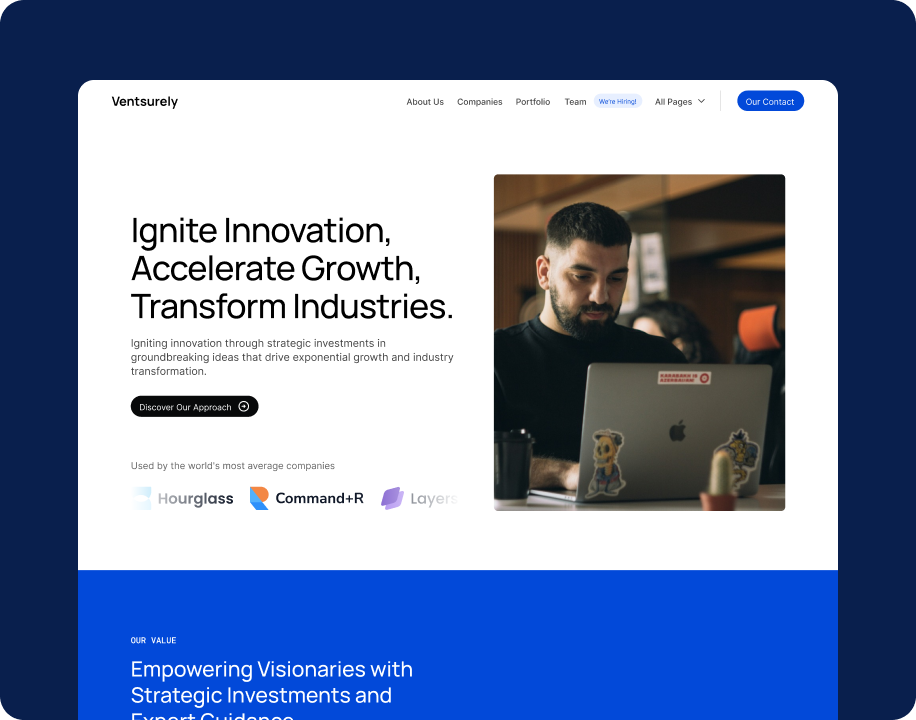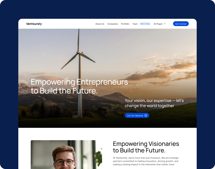 Ventsurely is a sleek, minimalist Webflow template crafted for venture capital investment companies, designed to present information with clarity and build trust with investors and clients. Its professional and clean aesthetic ensures a streamlined user experience, making complex financial data accessible and engaging.