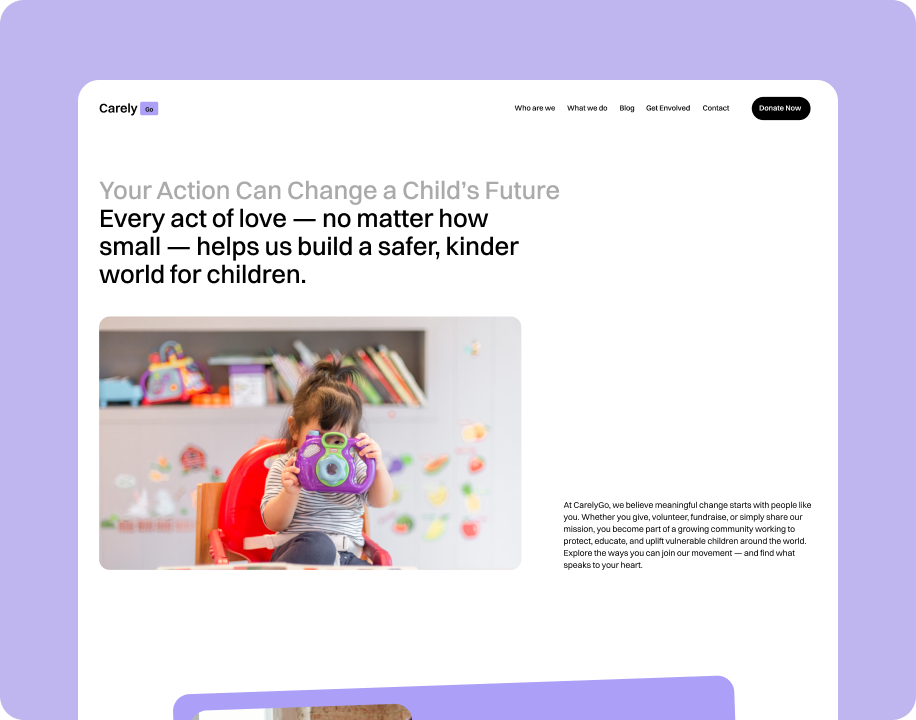 With easy customization and a cheerful yet professional look, CarelyGo is the perfect foundation for organizations that believe every child deserves love, care, and opportunity.