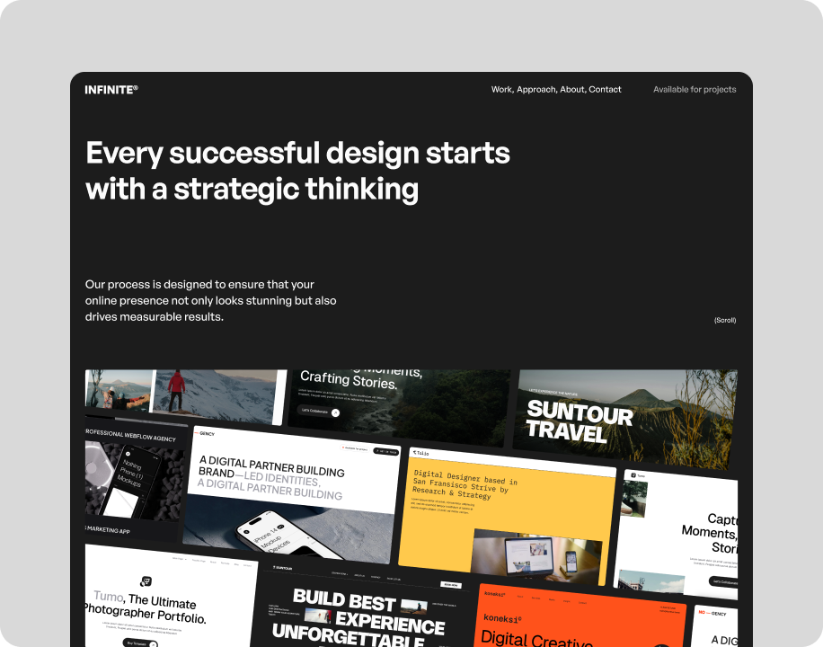 Infinite Studio: A sophisticated Webflow template for creative agencies. Blending dark and light designs, it offers a minimalist yet impactful online presence. Bold typography enhances readability and professionalism, building client trust.