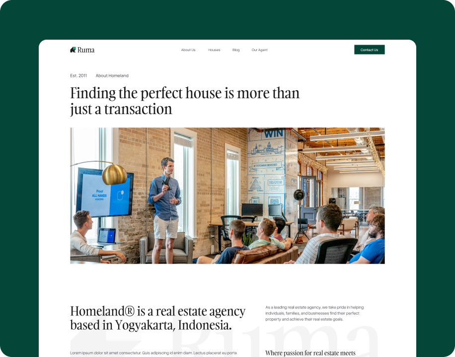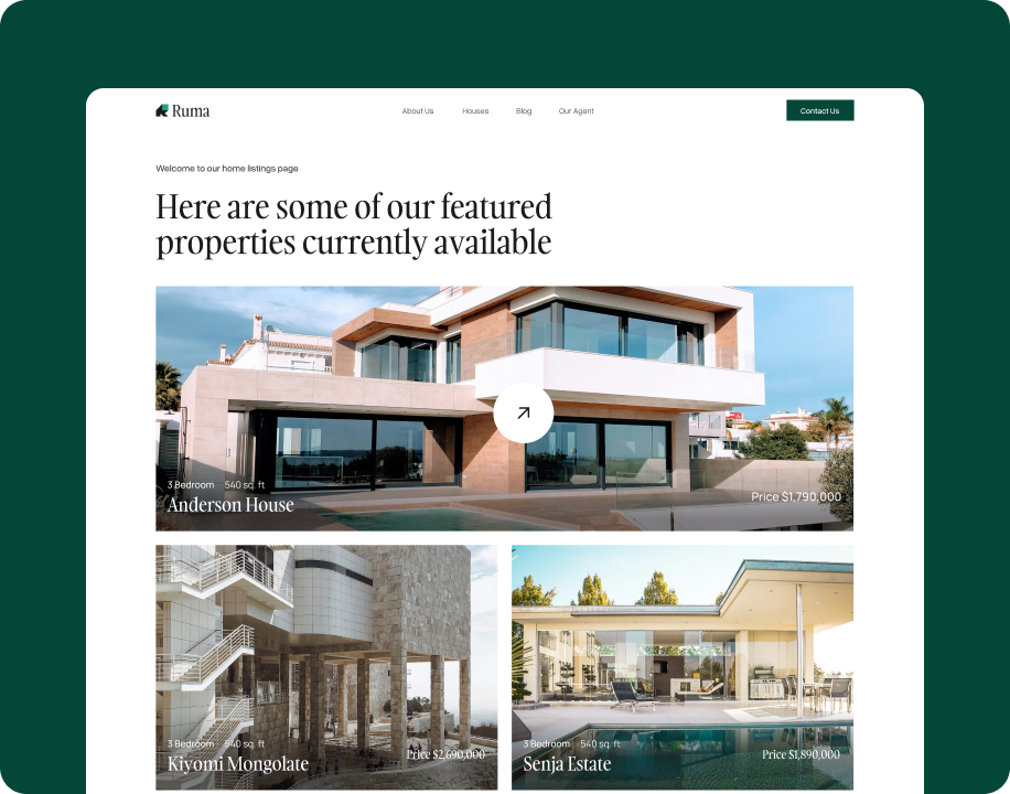 Ruma emerges as a refined, minimalist yet sophisticated real estate platform, distinguished by its simple elegance and a refreshing palette. Crafted to enhance your real estate ventures, Ruma offers a smoothly navigable and professionally polished interface, ensuring an exceptional browsing experience for your clientele.